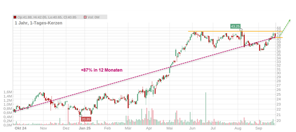 Das Wertpapier hatte von März bis Juni eine sehr starke Phase und ging dann in eine Seitwärtsbewegung über. Es hat sich eine Widerstandslinie mit mehreren Kontaktpunkten gebildet. Sobald es gelingt, sich mit Schlusskursen darüber zu etablieren, könnte der nächste starke Move folgen. Das per Measured Move ermittelte Kursziel liegt bei etwa 47 EUR.
