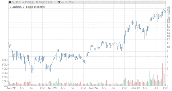 Für Anleger, die das höhere Risiko nicht scheuen, könnte es sich lohnen, auf eine Fortsetzung des dynamischen Trends bei Mirion Technologies zu setzen. Wird das Rekordhoch (25,16 Dollar) geknackt, sind Notierungen im Bereich der runden 30-Dollar-Marke ein realistisches Ziel.