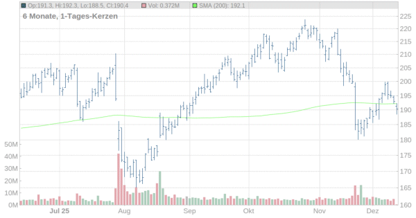 Die hohen Kosten für den Zukauf drückten zunächst auf die Stimmung. In den vergangenen beiden Wochen konnte sich der Aktienkurs aber wieder erholen und zwischenzeitlich die 200-Tage-Linie, die den mittelfristigen Trend anzeigt, zurückerobern. Die runde 200-Dollar-Marke verhinderte aber weitere Avancen und der Kurs fiel erneut in den Bereich des gleitenden Durchschnitts zurück.