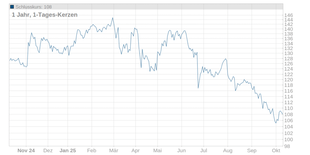 Fazit: Seit Juni befindet sich die Aktie in einem Abwärtstrend. Bildet sich nun keine Unterstützung, geht der Abwärtstrend erstmal in Richtung 120 US$ weiter. Die Stimmung bei den Analysten lässt ebenfalls keinen Aufbruch erkennen. Nur ein Analyst rät zum Kaufen, 13 von 16 Analysten raten zum Halten. Das höchste Kursziel liegt bei 150 US$ und bietet Ihnen ein Potenzial von 20%. Mit einem KGV von 27 ist die Aktie moderat bewertet.