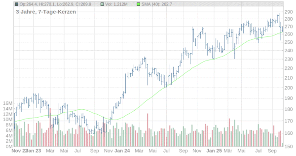 Anfang Oktober hatte die Travelers-Aktie bei 288 Dollar ein neues Allzeithoch erreicht. In der Folge kam es zu einer Korrektur, bei der die 200-Tage-Linie kurzzeitig unterschritten wurde. Nach der Zahlenvorlage drehte der Kurs aber dynamisch nach oben und konnte sich in den vergangenen Tagen wieder über dem gleitenden Durchschnitt etablieren.