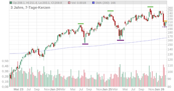 Der Chart zeigt einen übergeordneten Aufwärtstrend mit höheren Hochs und höheren Tiefs, der im Jahr 2023 bei rund 90 US-Dollar startete. Aktuell sehen wir jedoch eine deutliche Korrektur. Nach einem Hoch von fast 260 US-Dollar im November 2025 ist die Aktie zuletzt unter Druck geraten. Aktuell notiert sie im Bereich von 210 US-Dollar. Erst bei einem nachhaltigen Sprung über 212 US-Dollar hellt sich das Bild wieder auf. Bei 196 US-Dollar liegt eine psychologisch wichtige Marke. Rutscht die Aktie darunter, könnten die Kurse weiter in Richtung 160 US-Dollar nachgeben.