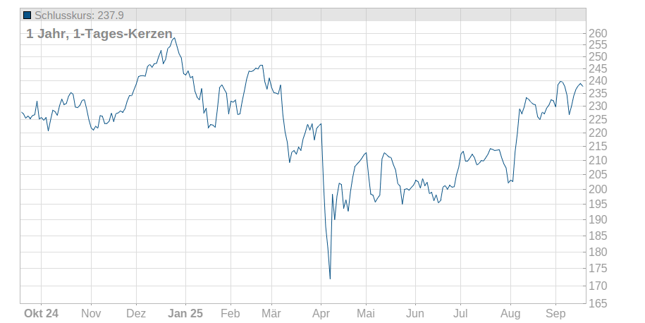 Fazit: Apple befindet sich trotz stärkeren Korrekturen immer noch in einem langfristigen Aufwärtstrend. Bei 250 US$ ist mit einem kleinen Widerstand zurechnen. Die Stimmung bei den Analysten zeigt positive Tendenzen. 28 von 46 Analysten raten Kaufen. Das höchste Kursziel wurde nun auf 305 US$ hoch gesetzt. Langfristig halte ich das Kursziel für möglich, auch wenn die Tech-Aktie mit einem KGV von derzeit 32 kein Schnäppchen mehr ist … das sind Marktführer in der Regel nie.