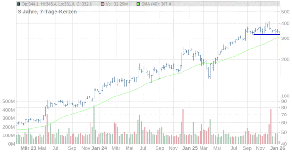 Der Aufwärtstrend ist nicht in Gefahr. Der Kursrückgang könnte sich als gute Einstiegsgelegenheit erweisen. Erst bei einem Fall unter die bei ungefähr 300 Dollar verlaufende, steigende 200-Tage-Linie würde sich die Charttechnik deutlich eintrüben. Aktuell spricht aber viel dafür, dass die Broadcom-Aktie ihren dynamischen Aufwärtstrend bald wieder aufnehmen kann. Ziel für die nächsten Monate ist das Allzeithoch bei rund 415 Dollar.