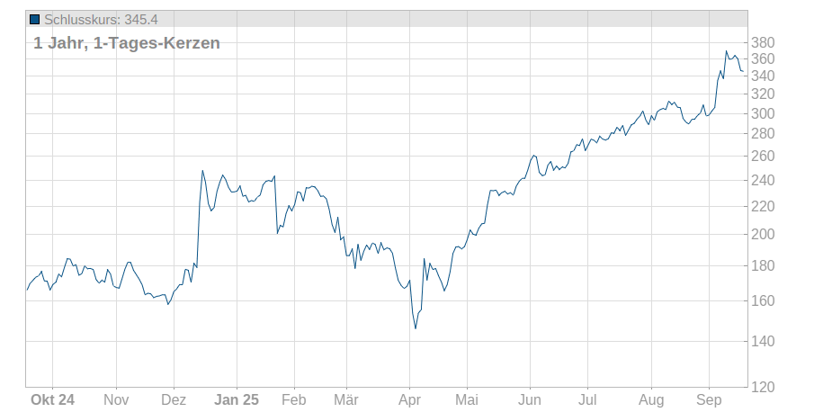 Fazit: Der KI-Sektor ist weiterhin sehr gefragt und das spiegelt auch der Aktienchart wider, wie Sie oben sehen. Die Aktie befindet sich in einem Aufwärtstrend und ist in Richtung 350 US$ nach oben ausgebrochen. Auch bei den bei den Analysten ist die Stimmung positiv. 40 von 43 Analysten raten zum Kauf. Angesichts des anhalten KI-Trends halte ich das höchste Analystenkursziel von 425 US$ für realistisch. Allerdings sollten Sie bedenken, dass die Tech-Aktie mit einem KGV von 54 schon recht hoch bewertet ist und deshalb anfällig für Korrekturen.