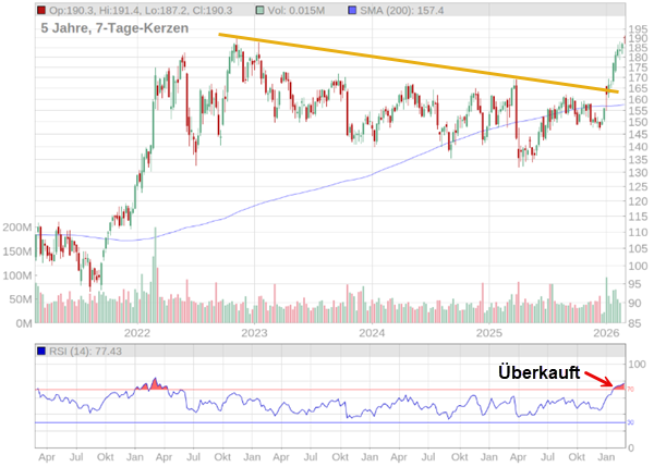 Für Einkommensinvestoren bleibt Chevron ein „Muss“. Das Unternehmen hat die Dividende seit 38 Jahren in Folge erhöht. Diese liegt bei etwa 3,6 %. Das erwartete Kurs-Gewinn-Verhältnis hat mit 27 bereits einen etwas höheren Wert erreicht, was die aktuelle Wachstumsfantasie widerspiegelt. Nach einer längeren Phase der Seitwärtsbewegung (2023 bis Ende 2025) ist der Knoten Anfang 2026 geplatzt. Die Aktie hat den hartnäckigen Abwärtstrend (orange Linie) der letzten Jahre durchbrochen. Mit einem aktuellen Kurs von rund 190 US-Dollar befindet sich Chevron in einem starken Aufwärtstrend. Der RSI-Indikator liegt bei über 77. Das bedeutet, die Aktie ist aktuell „überkauft“. Kurzfristig könnte es also zu Rücksetzern kommen, bevor der nächste Anstieg folgt.