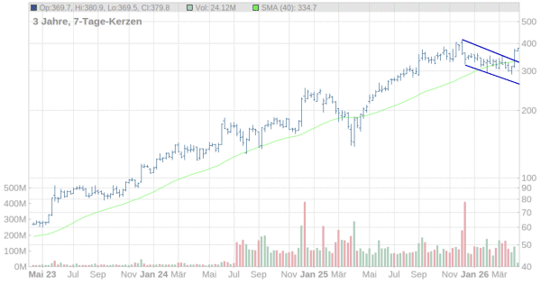 Erstes Ziel ist das Allzeithoch, das im Dezember bei knapp 415 Dollar erreicht worden war. Gelingt der Ausbruch auf neue Hochs, ist mittelfristig die nächste runde Marke bei 500 Dollar ein realistisches Ziel.