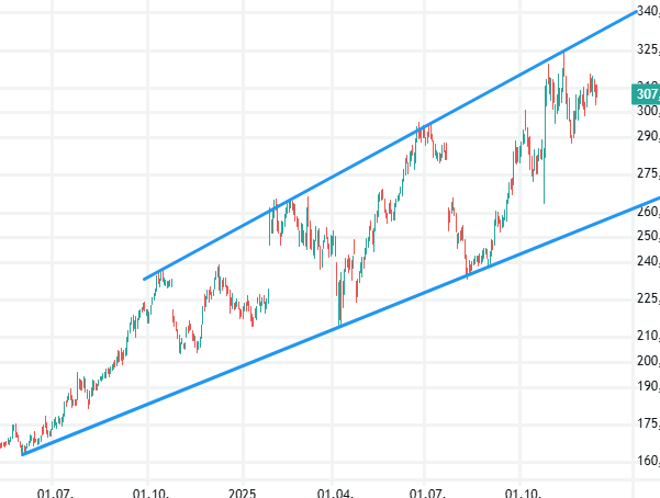 Aufwärts. Klar wackelt es zwischendrin und das nicht zu knapp. Aber langfristig ist das ein wunderschöner Kanal. Ob wir wirklich noch einmal den unteren Bereich anlaufen? Das bezweifle ich aktuell. Aber es kann immer Themen geben, warum der gesamte Sektor nachgibt. Nur vielleicht stehen wir dann schon weiter rechts im Chart und somit ist die untere Linie wesentlich höher.