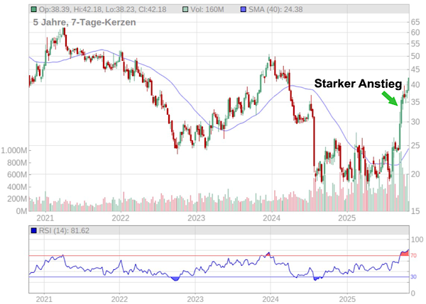 Im Chart sehen wir eine Trendwende der Aktie. Nach einer Phase der Bodenbildung ist das Papier in eine Aufwärtsbewegung übergegangen. Es hat sich ein dynamischer Aufwärtstrend etabliert. Die Notierungen haben nach der 40-Wochenlinie wichtige Widerstände überwunden. Ein nachhaltiger Ausbruch über die Zone bei 51 USD würde die Bodenbildungsphase endgültig beenden. Kurzfristig könnte die Aktie nach ihrer starken Vorstellung zurücksetzen, wie wir am überhitzten RSI erkennen können.