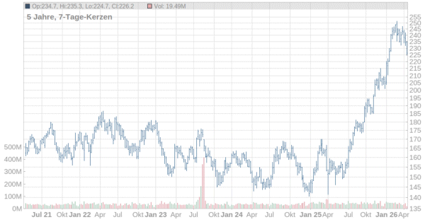 Im Sommer 2025 nahm die Aktie von Johnson & Johnson mit dem Ausbruch über ihren alten Höchststand vom April 2022 bei 187 Dollar ihren langfristigen Aufwärtstrend wieder auf. Anfang März markierte der Titel bei 252 Dollar sein vorläufiges Rekordhoch. Von hier aus kam es zu einem Rücksetzer um rund 10%, der jetzt einen günstigeren Einstieg ermöglicht.