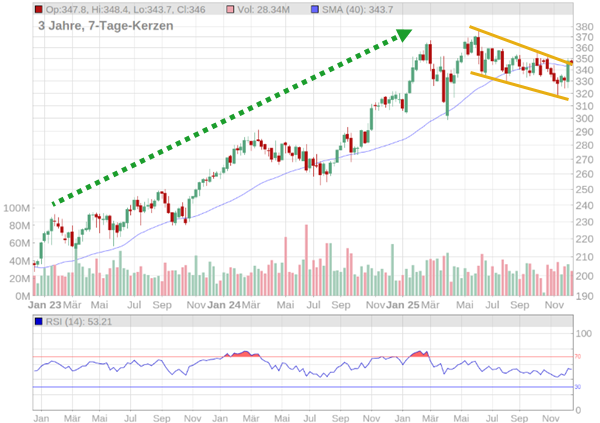 Visa wird aktuell mit einem Kurs-Gewinn-Verhältnis von 34 gehandelt, was für ein Unternehmen mit dieser Marktstellung und diesen Margen absolut üblich ist. Nach einer Phase der Konsolidierung konnte die Aktie zuletzt die blaue 40-Wochenlinie zurückerobern und den orangen Trendkanal nach oben verlassen. Solange die Unterstützung bei etwa 320 USD verteidigt wird, bleibt das langfristige Aufwärtsszenario intakt. Auch die kontinuierlichen Aktienrückkäufe und die verlässliche Dividendenpolitik stützen den Kurs nach unten ab.