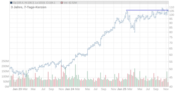 Ein erneuter Anlauf bahnt sich jetzt an. Gelingt diesmal der nachhaltige Ausbruch auf neue Hochs, dürfte der Startschuss für eine mittelfristige Trendbewegung fallen. Mittelfristig sind dann Notierungen im Bereich von 130 Dollar ein realistisches Ziel.