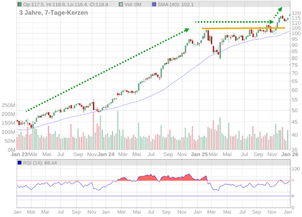 Mit einem KGV2026e von 49 ist das Walmart-Papier bereits hoch bewertet. Charttechnisch befindet sich die Aktie in einem stabilen Aufwärtstrend und notiert derzeit bei etwa 118 USD. Solange die Unterstützung im Bereich von 105 USD hält, bleibt das Chartbild aus meiner Sicht klar bullisch.