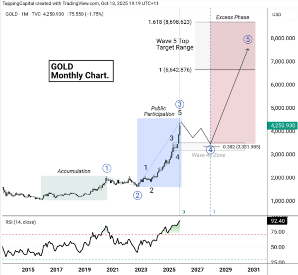 Gold steht an einem entscheidenden Punkt im langfristigen Wellenzyklus. Der Markt befindet sich nahe dem Ende von Welle 3, einer Phase, die von zunehmender öffentlicher Beteiligung und starkem Momentum geprägt war. Im Anschluss dürfte eine mehrjährige Konsolidierung (Welle 4) folgen, die den Preis in den Bereich von 3.200 bis 3.500 US-Dollar zurückführt. Danach könnte eine neue, spekulativ getriebene Aufwärtsphase einsetzen, die den Goldpreis bis 2030 in Richtung 6.600 bis 8.600 US-Dollar treibt. Diese Struktur verdeutlicht, dass selbst in übergeordneten Aufwärtstrends zyklische Rücksetzer integraler Bestandteil eines gesunden Marktverlaufs bleiben und Chancen für die nächste Aufwärtsbewegung eröffnen.