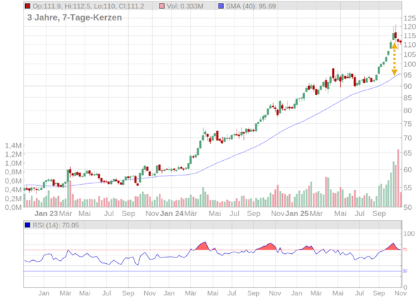 Bis Mitte Oktober war bei Xetra-Gold ein sehr starker Aufwärtstrend zu beobachten. Der Preis stieg von etwa 90 auf 120 Euro. Nach dem Erreichen des Allzeithochs gab es eine Korrektur. Der Abstand zur blauen 40-Wochenlinie ist immer noch sehr groß. Der RSI zeigt ein überkauftes Niveau, was einen weiteren Kursrückgang begünstigen könnte.