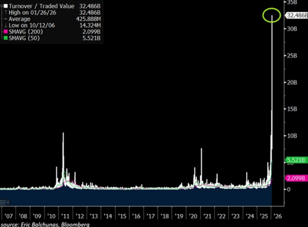 Handelsvolumen ist kein Stimmungsindikator, sondern ein Ausdruck von Kapitalbewegungen. Es zeigt, wo Marktteilnehmer bereit sind, Risiko einzugehen, Positionen aggressiv aufzubauen oder bestehende Engagements mit Nachdruck umzuschichten. Ein derart extremes Volumen entsteht nicht durch private Kleinanleger, sondern durch institutionelle Akteure, systematische Handelsstrategien und große Vermögensverwalter. Wenn diese Gruppen gleichzeitig aktiv werden, liegt in der Regel eine strukturelle Verschiebung zugrunde.